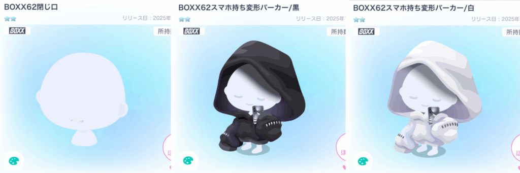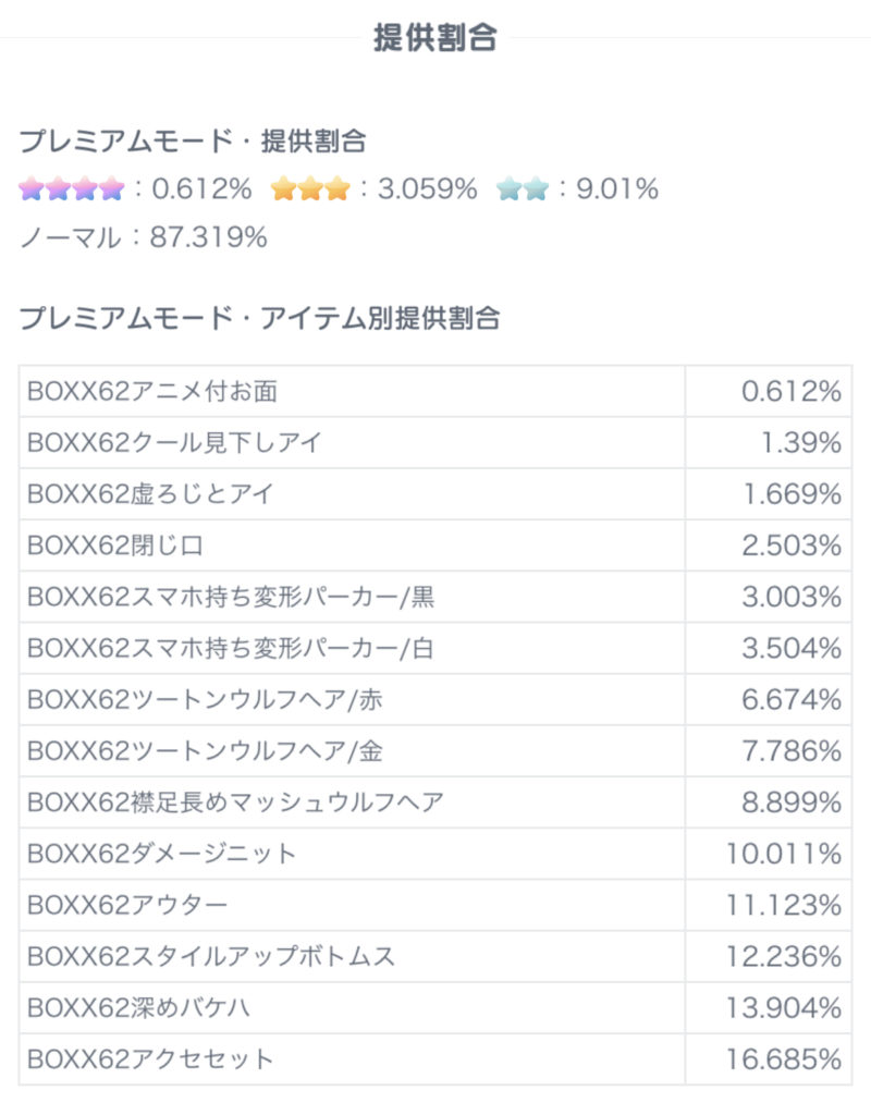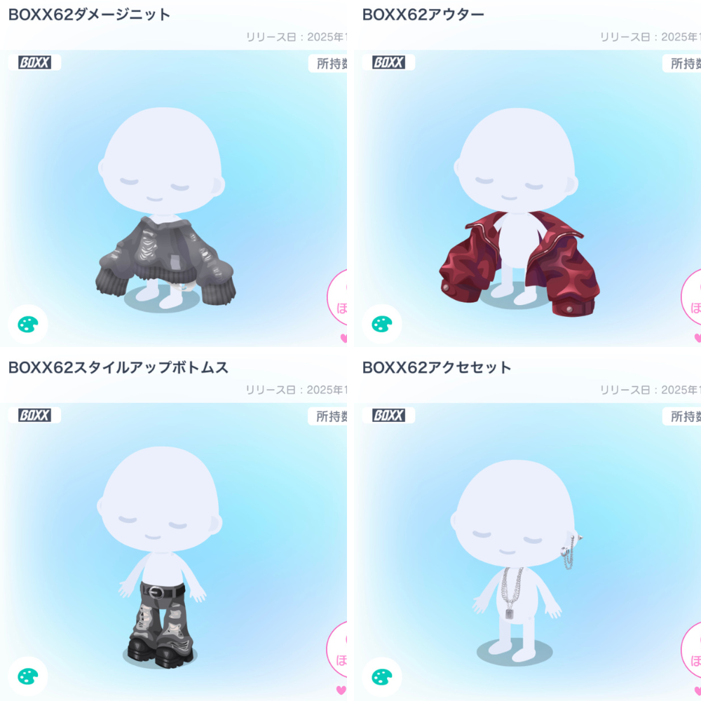 常に交換で人気のBOXXシリーズなので回してももったいなくはないと思う。無料アイテムとも組み合わせやすいボトムスは排出率も高めで回す価値はあるかな〜。